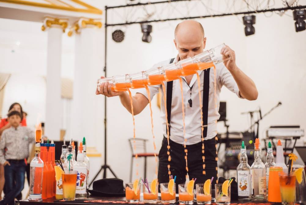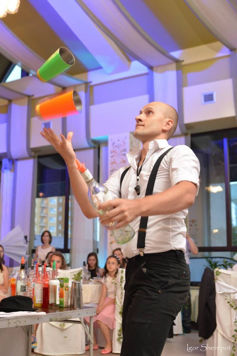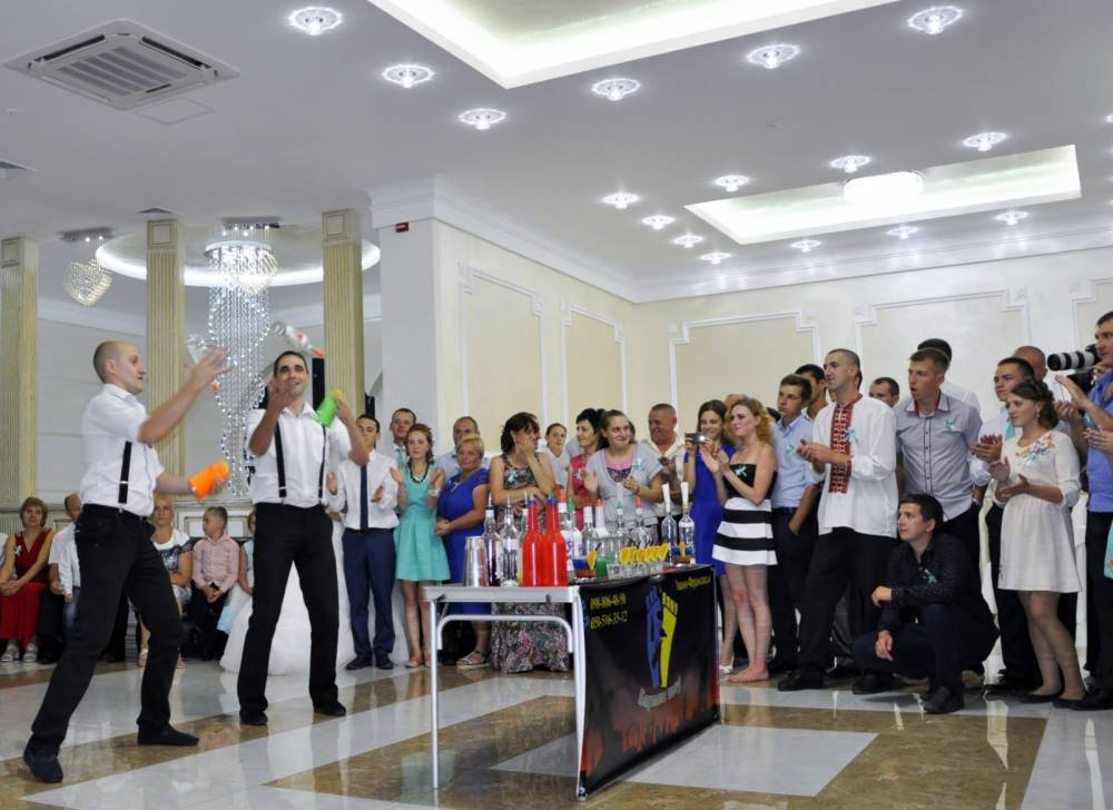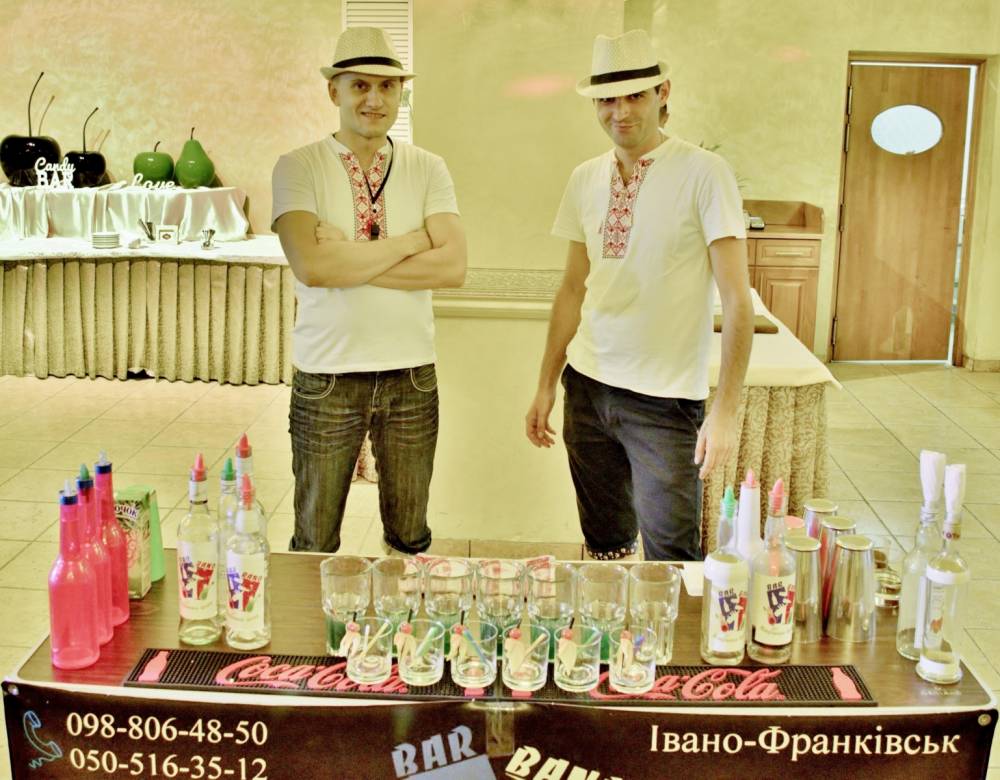 Сучасне весілля - це вишуканість та гармонія усіх його складових. Доречним доповненням свята стане дует барменів "BAR BAND", який пропонує: - бармен шоу в стилі "флайринг" з приготуванням екзотичних коктейлів; - алкогольні конкурси за участю гостей свята; - майстер-клас по приготуванні коктейлів та правильного їх споживання; - виїздний коктейль-бар з великим асортиментом алкогольних та безалкогольних змішаних напоїв; - пунші великого обєму(7л.) в асортименті.