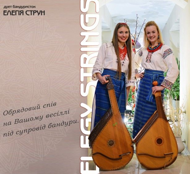 -50% на ОБРЯДОВИЙ СПІВ та РОЗПИС! Проводимо весільний обрядовий спів та розпис під супровід бандури Вишукана програма для виїзної церемонії одруження. Якщо у нашому репертуарі немає Вашої улюбленої композиції - ми з радістю її напишемо для Вас БЕЗКОШТОВО. Досвід роботи - більше 20 весіль. Ми пунктуальні, власний транспорт та технічне забезпечення. Можемо грати сидячи та стоячи:). Враховуємо усі побажання. Вартість наших послуг спонукатиме Вас зателефонувати:). Нове покоління бандуристок, які поєднують сучасні ритми із украінською фольклорною та популярною музикою.