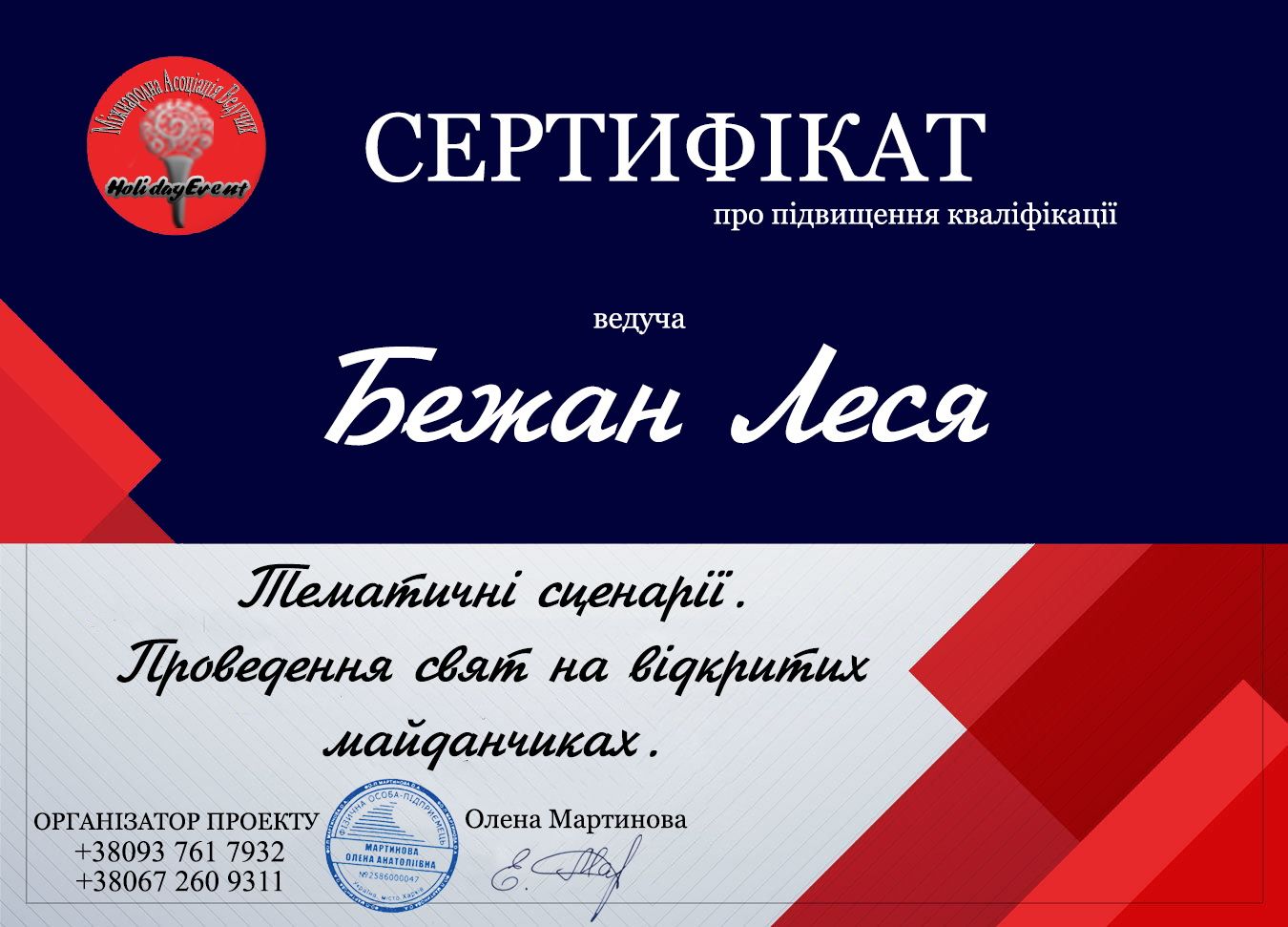 Я рада Вас приветствовать! Давайте знакомиться! Я Леся - певица и ведущая красивых праздников. И если Вы хотите, чтобы самый важный день в Вашей жизни не оставил равнодушными ни Вас, ни Ваших гостей, обращайтесь! Весело, душевно, ненавязчиво, культурно. Индивидуальный подход к каждому заказчику. Вместе мы сделаем Ваш праздник незабываемым!