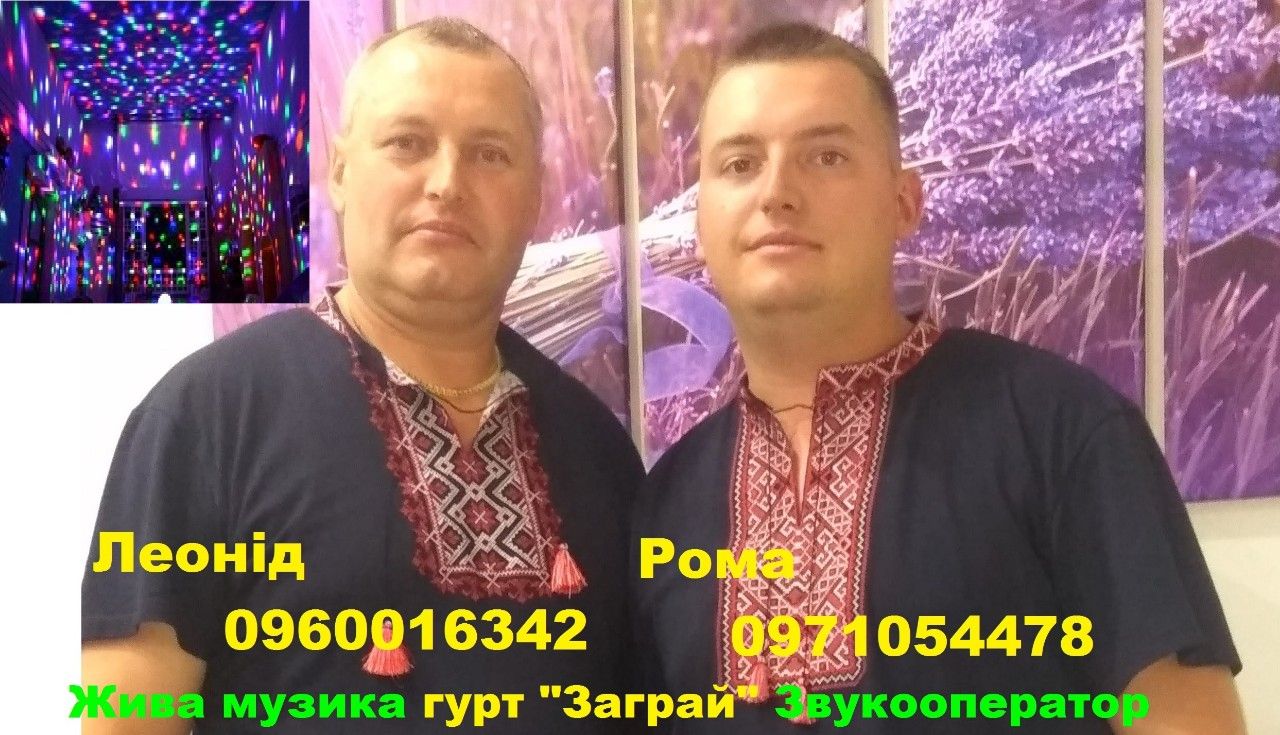 Музичний гурт "ЗАГРАЙ" з великим досвідом роботи та репертуаром пропонує свої послуги на ваше свято. Світлокольорове оформлення танцювального майданчика та тяжкий дим на перший танець для молодих.