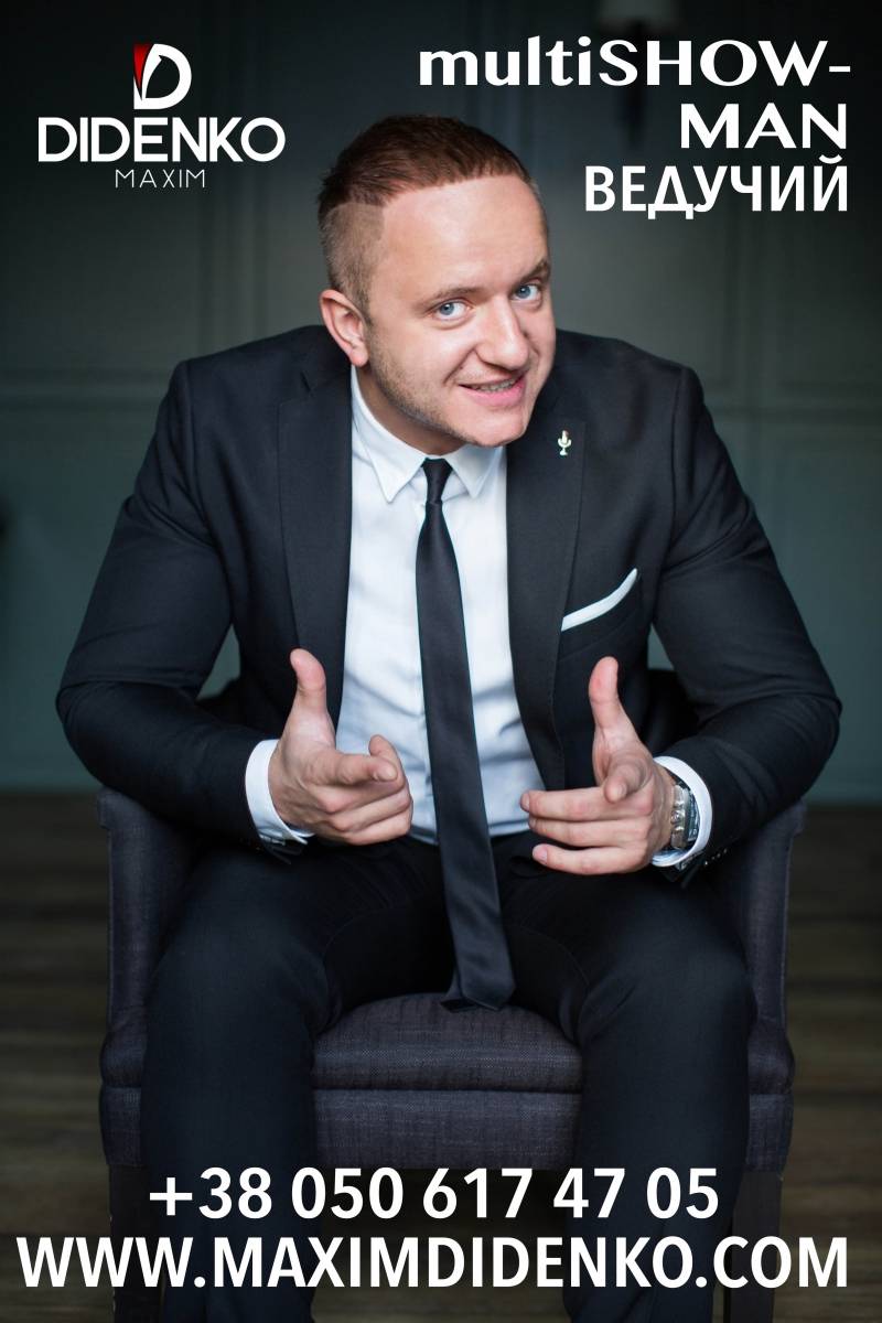 Цікавий і інтелігентний ведучий – яскраві, справжні і теплі емоції, європейський стиль ведення, без непристойних і при цьому все таки зі “стьобом”)) За більш ніж десять років роботи в шоу бізнесі я провів величезну кількість корпоративних вечорів, тематичних свят, ювілеїв, весіль, спортивних змагань, днів народження, випускних party, концертів, презентацій, конкурсів краси, фестивалів тощо ... Працював з різноплановою аудиторією від прогресивної молоді до найвищих державних діячів. Організовував різні заходи і писав для них сценарії. Мій величезний досвід до Ваших послуг. (рекламна фігня!!!! Насправді тепер можу і хочу позволити Собі просто створювати моменти від яких мурашки по шкірі і тепло в серці в тих людей для яких працюю, хоча НІ!!! Не працюю, а беру участь у створенні світлих Емоцій)) "Я люблю людей, люблю обмін енергією з аудиторією. Напевне, тому вони люблять мене (часом люблять, часом просто слухають)). Завжди поважаю бажання клієнта, вникаю в тонкощі свята, вмію знайти підхід до будь-якої людини і подарувати їй справжню усмішку" З повагою, Максим Діденко,