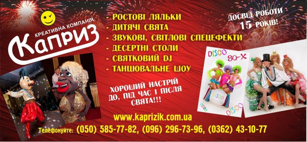 Организация праздничных событий: +38(050)585-77-82; +38(097)481-13-58. www.kaprizik.com.ua