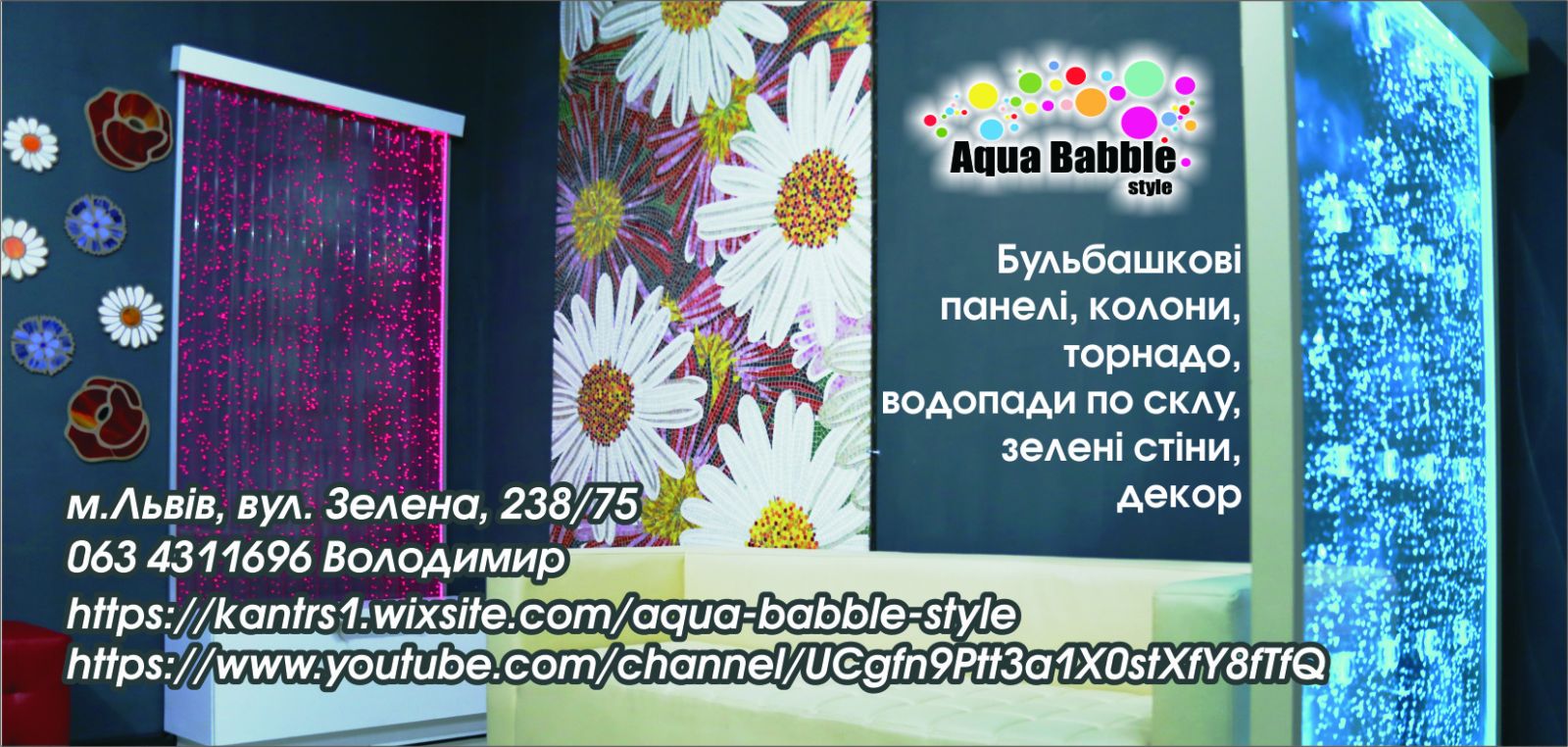 Наша компанія Aqua Babble Style займається виготовленням і орендою Бульбашкових - панелей, Моно - панелей, Бульбашкових колон і Водоспадів пошклу, Торнадо колон і Екслюзивних фуршетних Аквастолів.