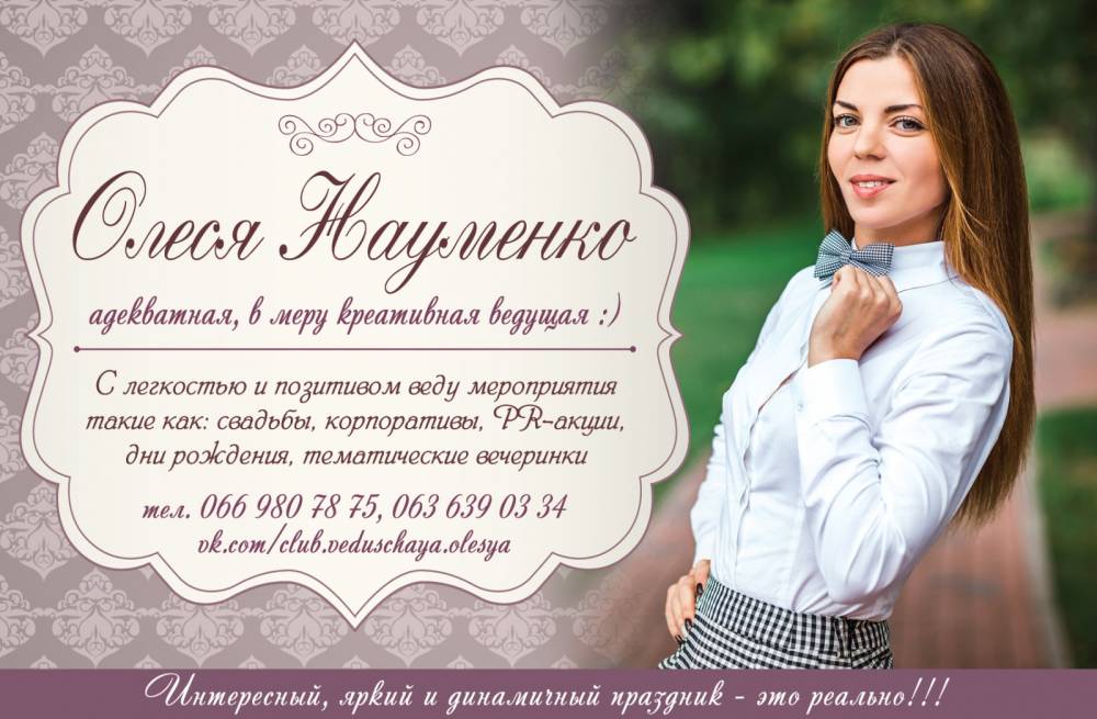 Олеся Науменко (NO ТАМАДА) - адекватная, в меру креативная ведущая:) Организацией и проведением праздничных событий занимаюсь 8 лет. Самое главное и любимое дело в моей жизни - работа ведущей! С легкостью и позитивом веду мероприятия такие как: свадьбы, корпоративы, PR-акции, презентации, дни рождения, тематические вечеринки. Интересный, яркий и динамичный праздник - это реально!!!