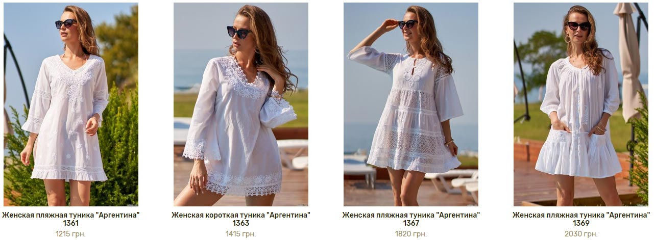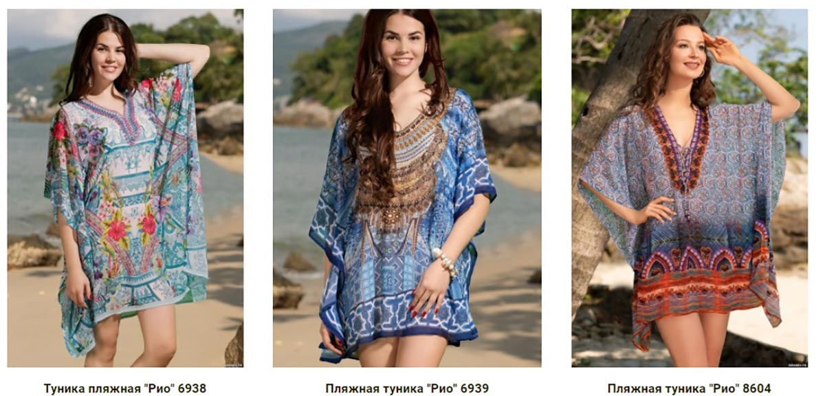 Модели пляжной одежды очень разнообразны. Так, итальянская марка Mia-Mia предлагает сарафаны и пляжные платья различной длины. Например, рубашка-туника "Доминикана" из тонкого хлопка в модную полоску сшитая в широком размерном ряде (42 (XS) - 54 (XXXL)), порадует поклонниц минимализма. Летом особенно популярен белый цвет, поэтому многие оценят комфорт и нежность сарафана "Аргентина" с кружевными вставками.