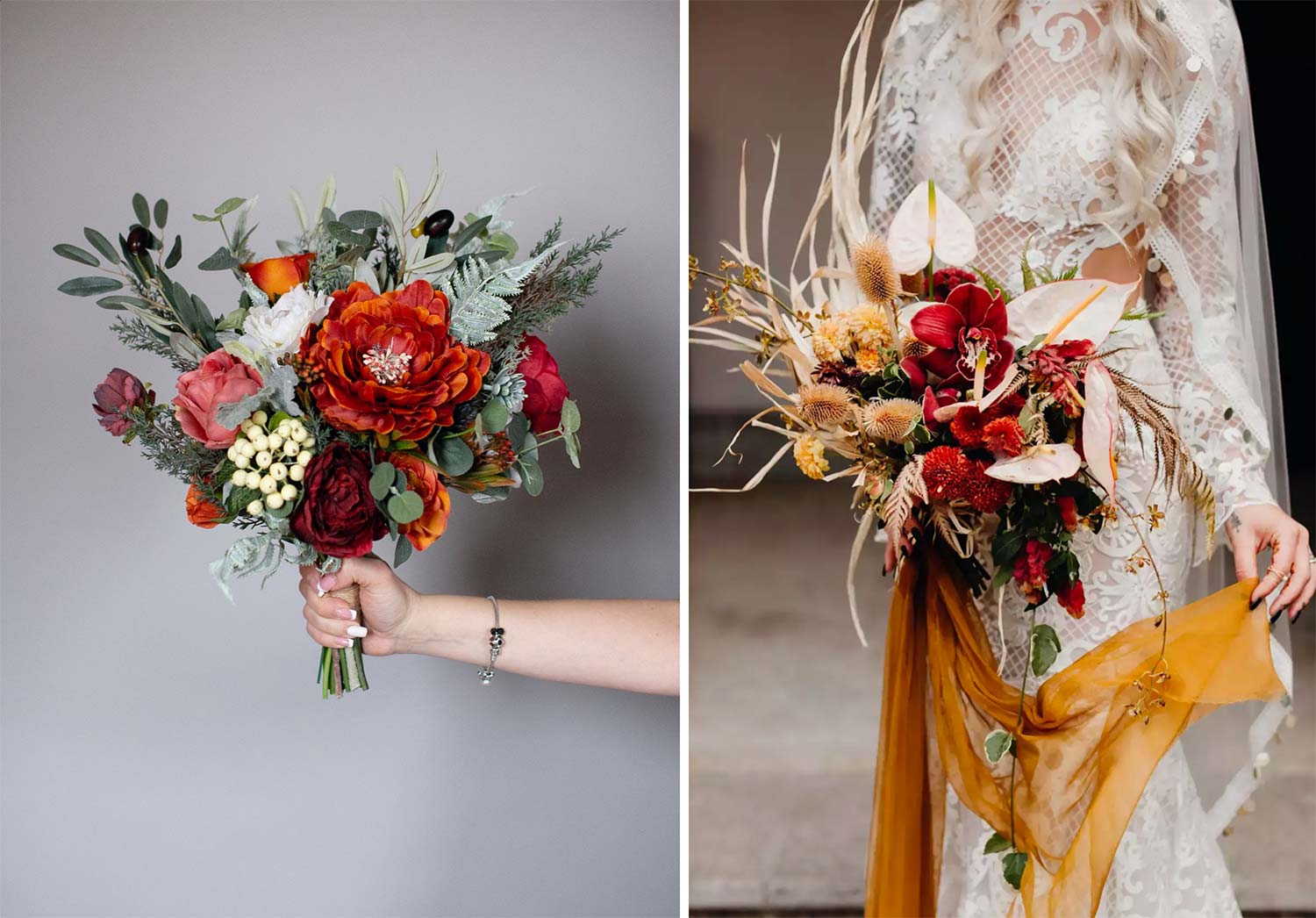 Для осеннего свадебного букета существует определенная цветовая гамма. Желтый, красный, оранжевый, бордовый, золотистый, горчичный, шоколадный, темно-зеленый, кирпичный, фиолетовый — выбирая растения для праздника, стоит обратить внимание именно на такие тона. Чтобы композиция не смотрелась аляписто, необходимо остановиться на двух-трех оттенках.