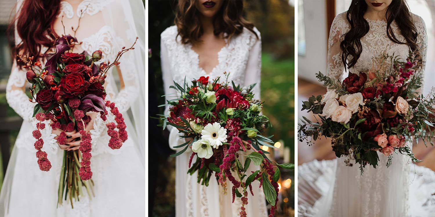 Красно-зеленая классика. Букет такой расцветки удачно подойдет к любому платью и стилистическому решению свадьбы. Основа композиции — красные астры, розы, анемоны или пионы. Зеленое дополнение — хризантемы, гортензии, георгины и, конечно, травянистые виды, такие как эвкалипт или амарант. В данной цветовой гамме отлично смотрятся объемные и слегка растрепанные букеты.