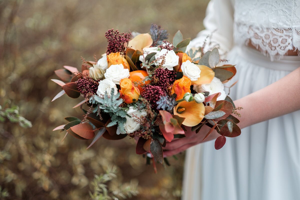 Составляя осенние свадебные букеты, можно смело пользоваться всеми «подарками», что дает нам это время года. Ветки рябины и шиповника, желуди, колосья пшеницы, сушеные травы и огромные кленовые и дубовые листья ярко-желтых, оранжевых и бордовых оттенков — брезговать подобной красотой уж точно не стоит. Сентябрь сам подкидывает стильные идеи.