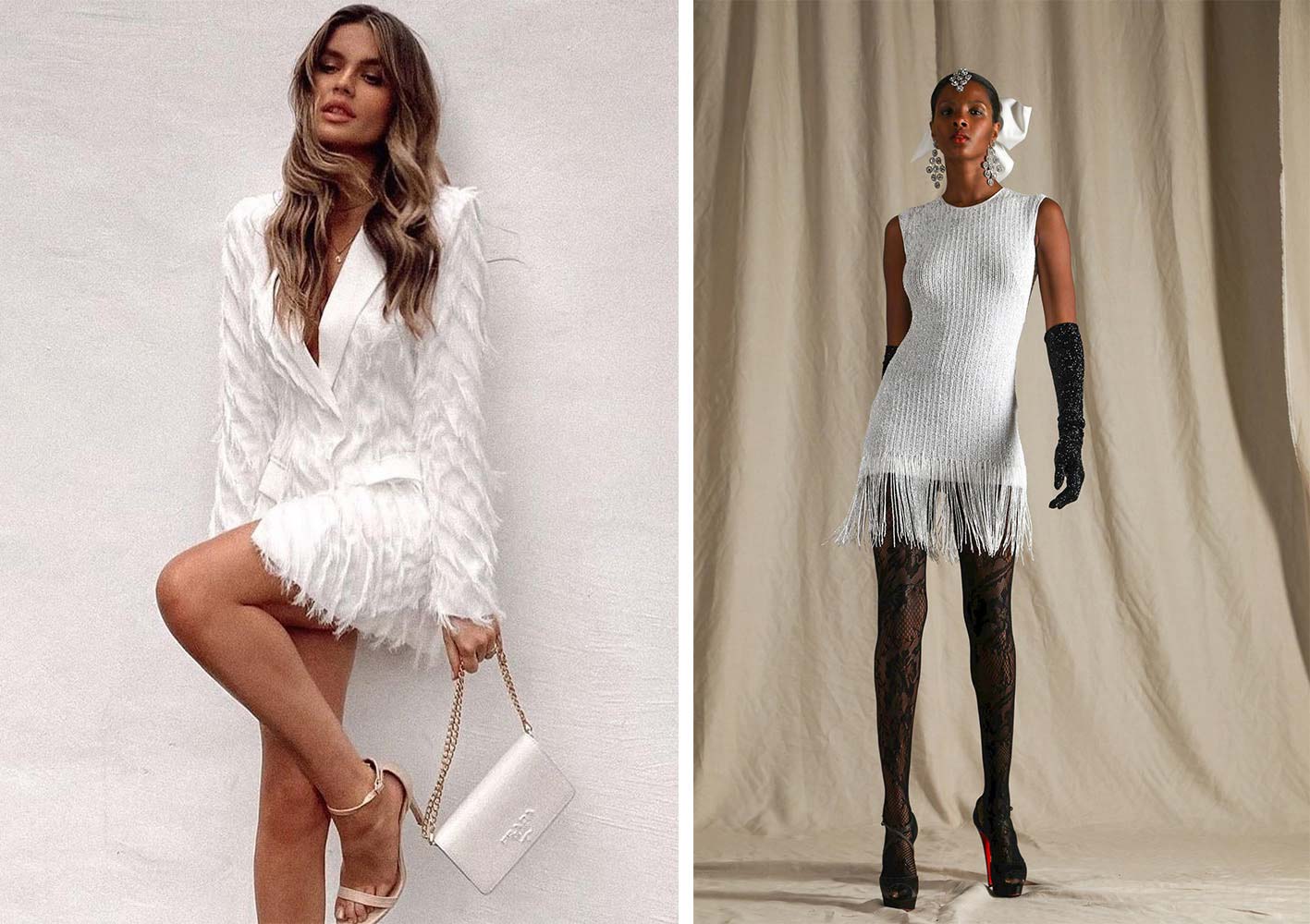 Добавить нотку праздничности, винтажа и задора помогут декоративные элементы в виде бахромы или перьев. При чем, существует немало вариантов исполнения свисающих деталей. Так, бахрома может быть выполнена из привычных нам нитей, жгутов, отрезков ткани. Кроме того, очевидно вдохновившись танцевальными костюмами, сегодня оборотов набирает бахрома из бисера, пайеток и страз. Как минимум, стоит хотя бы примерить платье с таким декором. Возможно, вам понравиться и удастся почувствовать себя на вечеринке Великого Гэтсби.
