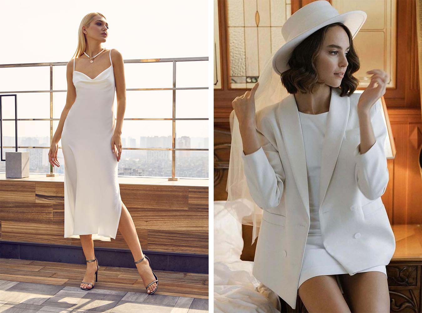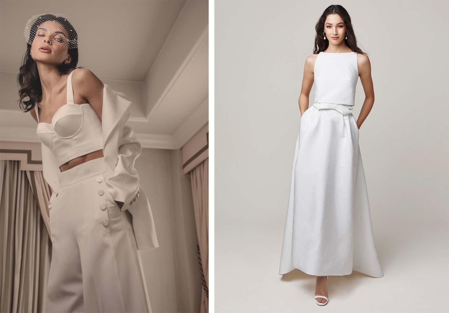 Что может быть более универсальным, чем раздельный наряд? Правильно, ничего, разве что костюм 3-ка (с пиджаком). Представьте только: покупая один наряд на роспись в ЗАГС, вы получаете сразу несколько предметов гардероба. Топ, юбка/брюки и пиджак. Любой из составляющих можно использовать в дальнейшем. Кроме того, такой образ подойдет для росписи во все времена года. Дополните его короткой фатой для невесты, чтобы завершить безупречный и роскошный свадебный наряд.