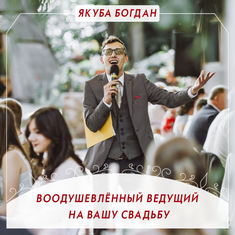 Драйвовий настрій гарантований кожному! Професійний ведучий обов'язково має володіти переліком основних вмінь – акторська майстерність, режисура, організаторські здібності та психологія. Мій учбовий заклад та робота у різних проектах наповнили мій багаж досвіду з повна. Освіта режисера відкриває для мене можливості тонко відчувати драматургію свята, настрій кожного гостя, блискавично реагувати і вирішувати питання під час самого проведення. За допомогою мого артистизму та імпровізації сценарій весілля перетворюється на смачне дійство. Всі відгуки моїх клієнтів зводяться до бездоганно підібраної конкусно-ігрової програми та дуже легкому стилю проведення. Мій стиль – це синтез української класики та європейської сучасності. Лозунг – головне не "що", а "як"! Саме по цій причині приділяю увагу кожній дрібниці весілля. Там де я ведучий, ви ніколи не почуєте і не побачите жартів нижче гідності освіченої людини. Тому Вам не доведеться червоніти за ведучого!
