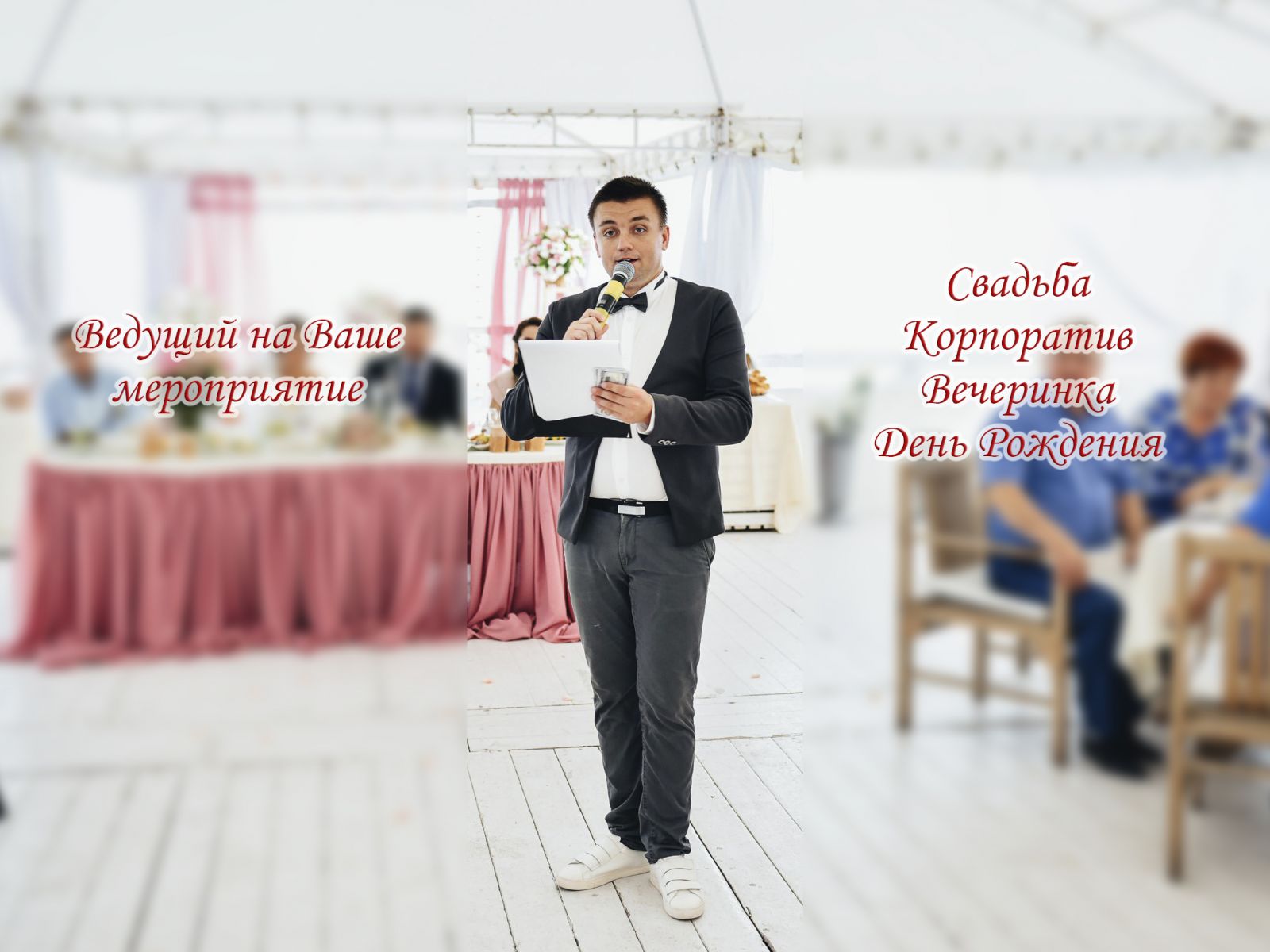ВСЕМ ПРИВЕТ! Ваш Ведущий - Николай Ткачев Я знаю как сделать Ваш день Ярким, Красивым и Незабываемым! Если Вы планируете: СВАДЬБУ, свой ДЕНЬ РОЖДЕНИЯ или КОРПОРАТИВ, то я буду Рад помочь Вам и, конечно же, провести Ваше мероприятие! Не просто провести, а сделать важное для Вас событие в жизни веселым, позитивным и ярким! Подарить Вам огромное количество эмоций и сделать Ваш день незабываемым! Так же хочу сказать и напомнить, что каждое мероприятие я готовлю индивидуально! Естественно БЕЗ ПОШЛОСТИ и СТАРЫХ конкурсов! Только СОВРЕМЕННАЯ и ИНТЕРЕСНАЯ ПРОГРАММА! Есть множество интересных предложений для Ваших мероприятий! Звоните и задавайте любые вопросы по поводу мероприятий. С Уважением, Человек, который всегда дарит настоящие эмоции и позитивное настроение – Ваш Ведущий Николай Ткачев