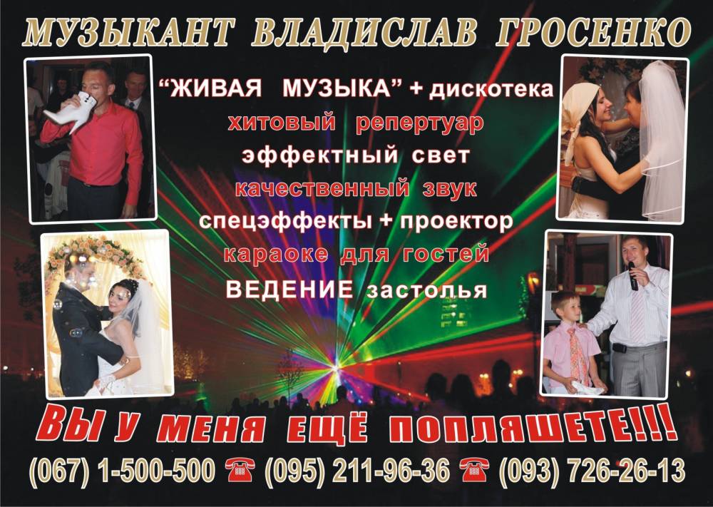 ПРАЗДНИК невозможен без музыки и танцев! Настроение нужно создать и мы готовы Вам в этом помочь! К Вашим услугам: - "живой" вокал + дискотека; - ведение развлекательной программы (тамада); - световое оборудование; - спецэффекты + видеопроектор. Мы сотрудничаем с ведущими, фото- и видеооператорами г. Николаева, ведь вместе мы помогаем Вам создать праздник. Именно это - наша работа!