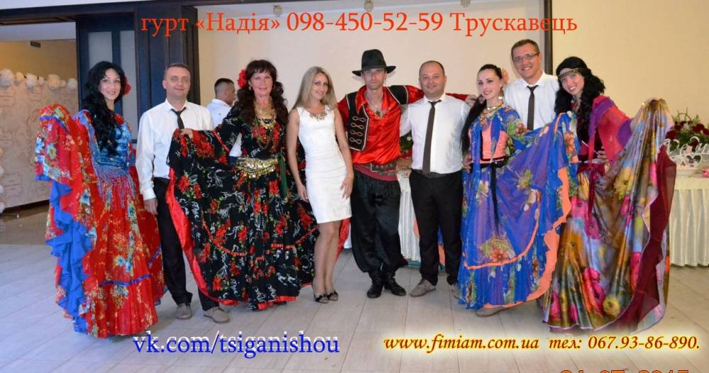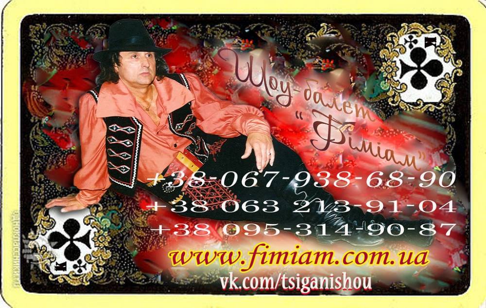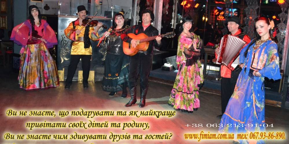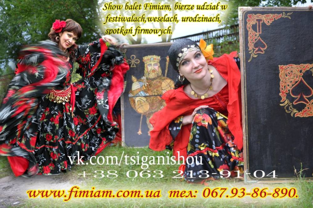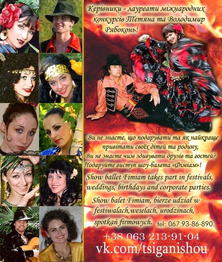 Шоу-балет "Фіміам" НАЙКРАЩИЙ ПОДАРУНОК ДЛЯ МОЛОДЯТ. Шоу циган шоу-балет"Фіміам" Без відомої «Циганочки» в нас не проходить жодне святкування днів народжень чи весіль. Циганський танець входить в групу найбільш популярних танців світу. Запальний ритм заставляє всіх присутніх піднятись зі своїх місць і, незалежно від віку, зануритись в цей кольоровий танок. Циганському танцю більше 15-ти століть, тому і не дивно, що він такий популярний. Ми зробимо Ваше весілля: незабутнім, яскравим, веселим. Внашому Шоу будуть задіяні всі гості-незалежно від віку. Телефо! нуйте-Домовимося. Нехай-щастить. 067-93-86-890. 063-213-91-04 www.fimiam.com.ua vk.com/tsiganisho