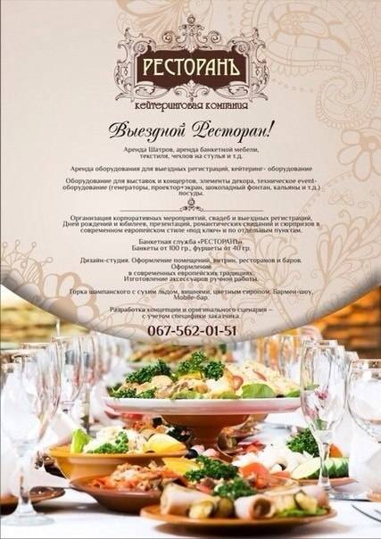 ВЫЕЗДНОЙ РЕСТОРАН!!телефон 067-562-01-51 Аренда Шатров Аренда банкетной мебели, текстиля, чехлов на стулья и т.д.Аренда оборудования для выездных регистраций , кейтеринг- оборудование, оборудование для выставок и концертов, элементы декора, техническое event-оборудование ( генераторы, проектор+экран, шоколадный фонтан, кальяны и т.д.) посуды.-Организация корпоративных мероприятий, свадеб и выездных регистраций, Дней рождений и юбилеев, презентаций, романтических свиданий и сюрпризов в современном европейском стиле «под ключ» и по отдельным пунктам. -Банкетная служба «РЕС ТОРАНЪ». Банкеты от 100гр., фуршеты от40 гр. -Дизайн-студия . Оформление помещений, витрин, ресторанов и баров. Оформление в современных европейских традициях. Изготовление аксессуаров ручной работы.-Горка шампанского с сухим льдом, вишнями, цветным сиропом. Бармен-шоу, Mobile-бар.-Разработка концепции и оригинального сценария – с учетом специфики заказчикаУВАЖАЕМЫЕ ЗАКАЗЧИКИ, ЖЕНИХИ И НЕВЕСТЫ, ЭТА ГРУППА СОЗДАНА НЕ ДЛЯ ТОГО, ЧТО БЫ НАВЯЗАТЬ ВАМ СВОИ УСЛУГИ. КОНЕЧНО, МЫ БУДЕМ РАДЫ СОТРУДНИЧАТЬ С ВАМИ, НО ТАК ЖЕ МЫ ХОТИМ ПРЕДЛОЖИТЬ СВОЮ ПОМОЩЬ ТЕМ, КТО ГОТОВИТЬСЯ САМОСТОЯТЕЛЬНО, ЗДЕСЬ ВЫ МОЖЕТЕ ПОЛУЧИТЬ АБСОЛЮТНО БЕСПЛАТНУЮ КОНСУЛЬТАЦИЮ У ПРОФЕССИОНАЛОВ, ЗАДАТЬ ЛЮБЫЕ ВОПРОСЫ, ПОЧЕРПНУТЬ ИНТЕРЕСНЫЕ ИДЕИ,МЫ БУДЕМ ИСКРЕННЕ РАДЫ ВАМ ПОМОЧЬ